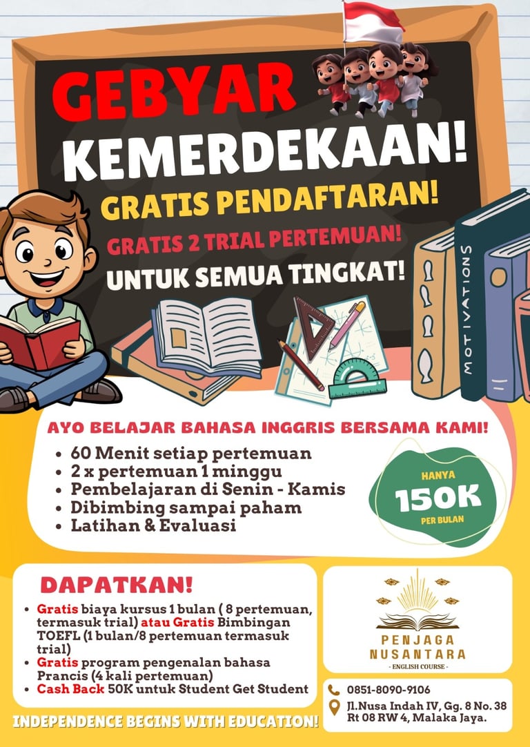 Dalam rangka memeriahkan Hari Kemerdekaan, Penjaga Nusantara English Course menghadirkan program spesial GEBYAR KEMERDEKAAN dengan penawaran yang sangat menguntungkan!